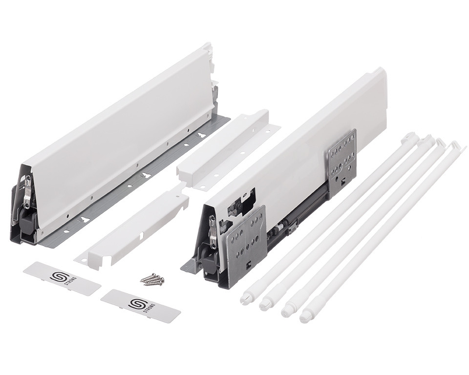 Fióksín csillapítással és üres oldallapokkal 2 pár magasító korláttal. Hossz.: 270mm, magasság: 204(225mm). Teherbírás 35 kg-ig. Szín fehér. Minden, amire szükség van a frontkihúzású fiók összeállítására megtalálható ebben a szettben. Belső fiókra meg kell még rendelni front panelt.