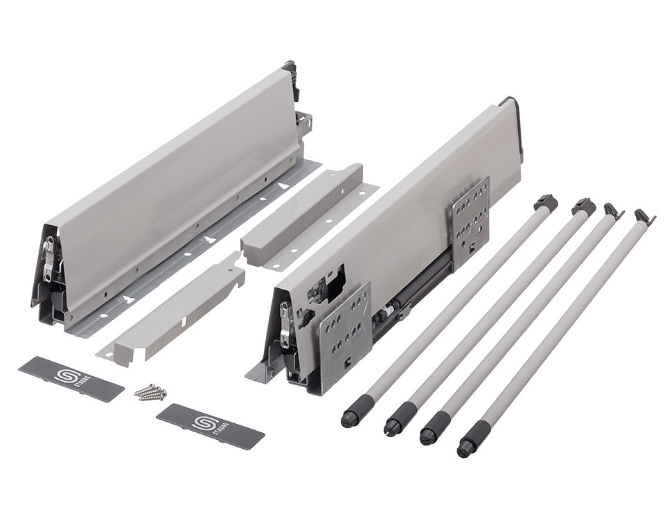 Fióksín csillapítással és üres oldallapokkal 2 pár magasító korláttal. Hossz.: 350mm, magasság: 204(225mm). Teherbírás 35 kg-ig. Szín szürke. Minden, amire szükség van a frontkihúzású fiók összeállítására megtalálható ebben a szettben. Belső fiókra meg kell rendelni front panelt a korpusz szélessége szerint.